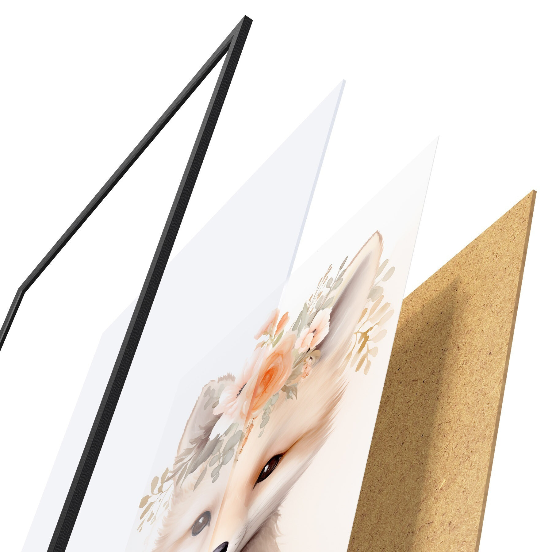 El póster consta de marco, plexiglás, imagen impresa y soporte de aglomerado. El póster puede colgarse inmediatamente en la pared gracias a los soportes de la parte posterior.