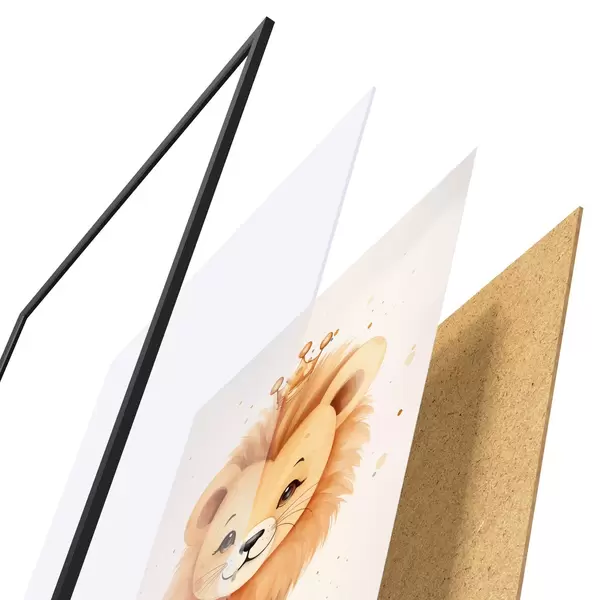 El póster consta de marco, plexiglás, imagen impresa y soporte de aglomerado. El póster puede colgarse inmediatamente en la pared gracias a los soportes de la parte posterior.