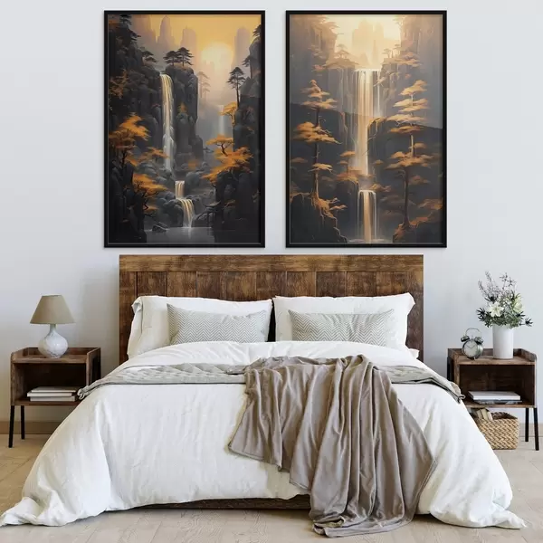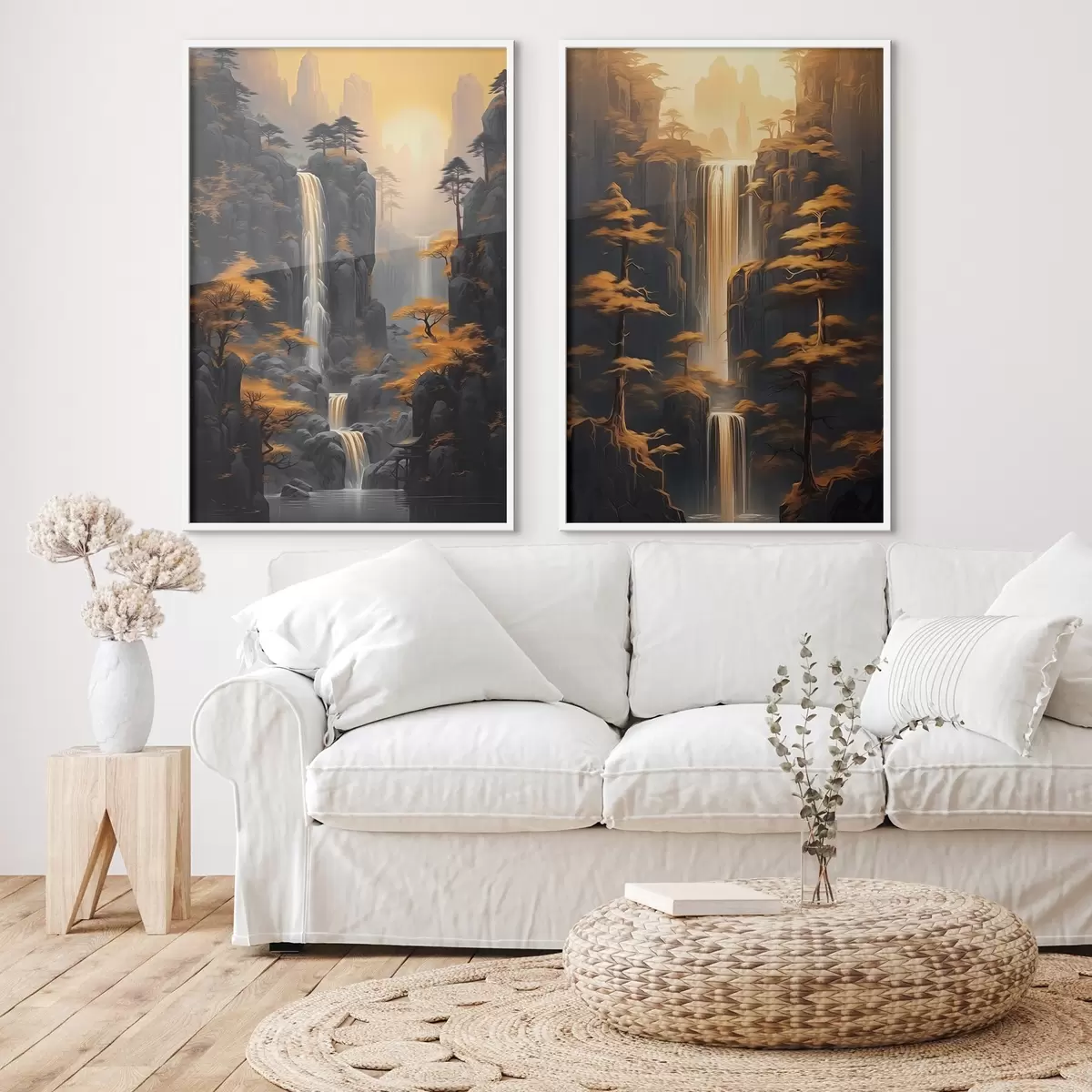 Poster Paisaje con cascada y montañas bañadas por una luz dorada Nr d00928