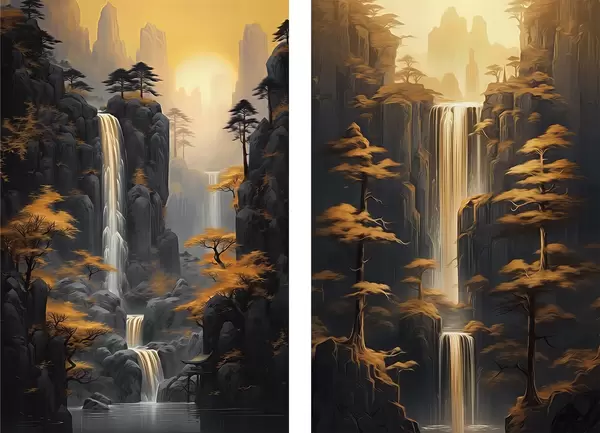 Poster Paisaje con cascada y montañas bañadas por una luz dorada Nr d00928
