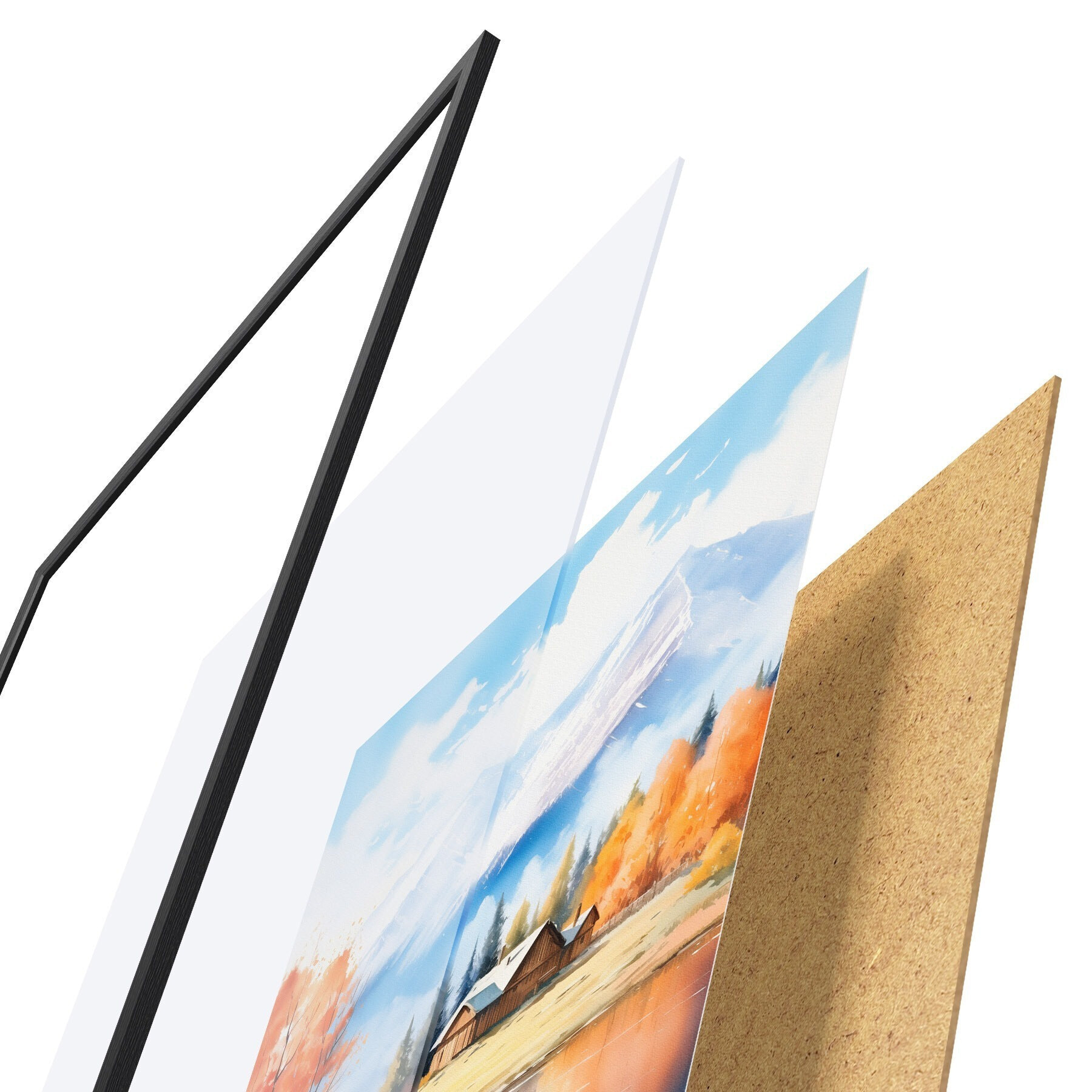 El póster consta de marco, plexiglás, imagen impresa y soporte de aglomerado. El póster puede colgarse inmediatamente en la pared gracias a los soportes de la parte posterior.