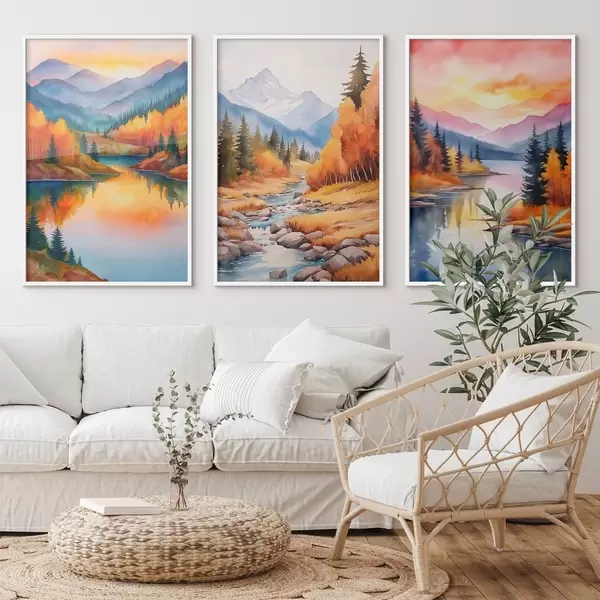Poster Paisaje montañoso otoñal en cálidos tonos crepusculares d00930