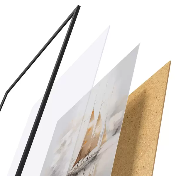 El póster consta de marco, plexiglás, imagen impresa y soporte de aglomerado. El póster puede colgarse inmediatamente en la pared gracias a los soportes de la parte posterior.