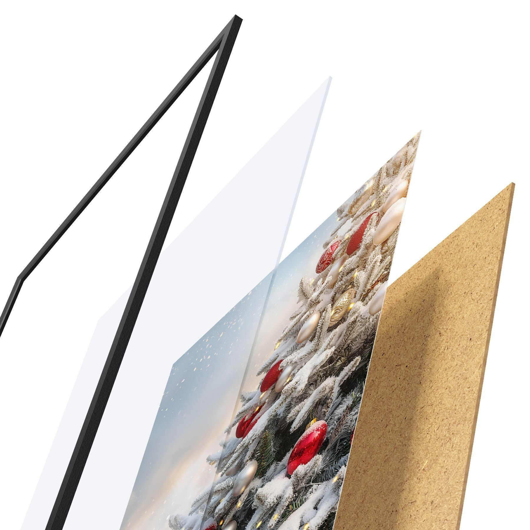 El póster consta de marco, plexiglás, imagen impresa y soporte de aglomerado. El póster puede colgarse inmediatamente en la pared gracias a los soportes de la parte posterior.