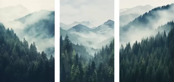Poster Nubladas montañas de pinos cubiertas de suaves tonos verdes y azules. Nr d00964