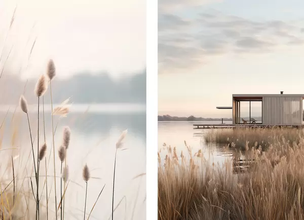 Poster Cañas suaves junto a un lago tranquilo y una cabaña moderna en la orilla. Nr d00970