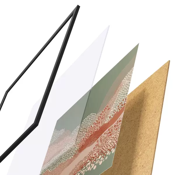 El póster consta de marco, plexiglás, imagen impresa y soporte de aglomerado. El póster puede colgarse inmediatamente en la pared gracias a los soportes de la parte posterior.