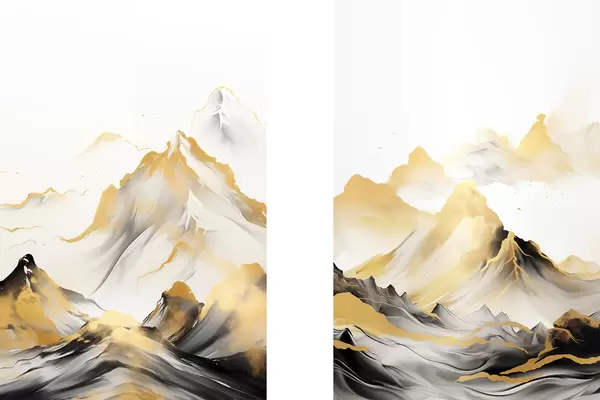 Poster Montañas amarillas y negras con picos nevados, estilo de pintura con tinta china, cordillera minimalista. d01002