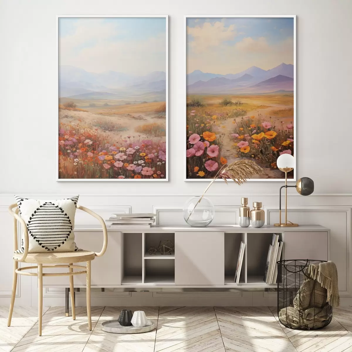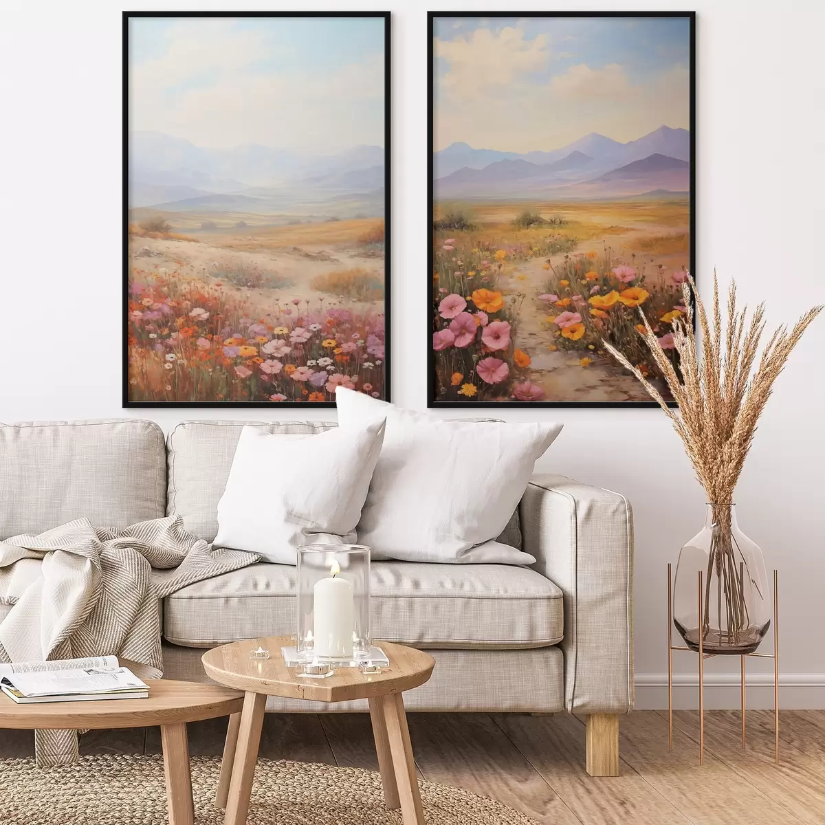 Poster Paisaje, un campo de flores coloridas con montañas al fondo, colores suaves y pastel. d01003