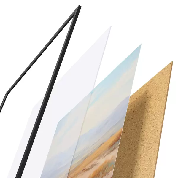 El póster consta de marco, plexiglás, imagen impresa y soporte de aglomerado. El póster puede colgarse inmediatamente en la pared gracias a los soportes de la parte posterior.