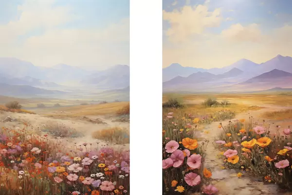 Poster Paisaje, un campo de flores coloridas con montañas al fondo, colores suaves y pastel. d01003
