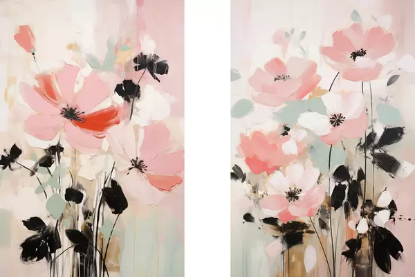 Poster Flores rosas y negras con hojas, colores pastel suaves, arreglo floral abstracto, arte minimalista. d01004