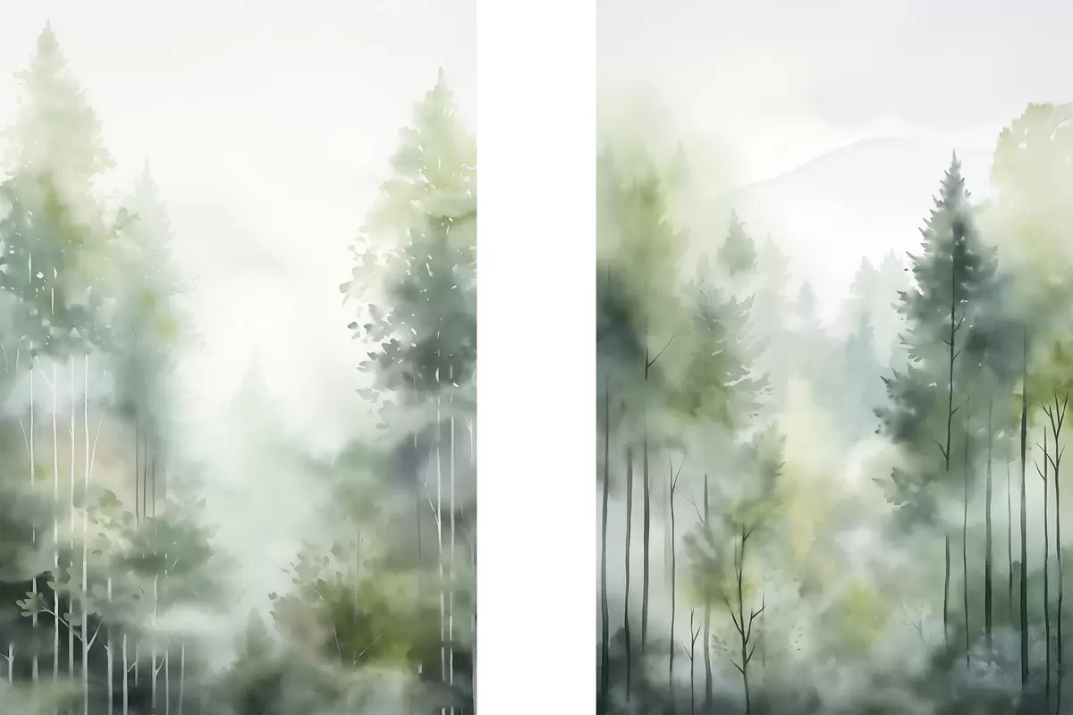 Poster Imitación de pintura en acuarela de un bosque abstracto con árboles altos y follaje verde, colores suaves y apagados. Nr d01005