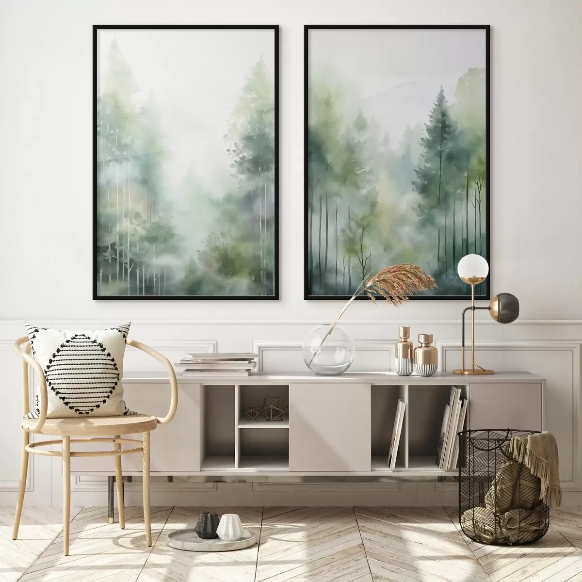 Poster Imitación de pintura en acuarela de un bosque abstracto con árboles altos y follaje verde, colores suaves y apagados. d01005
