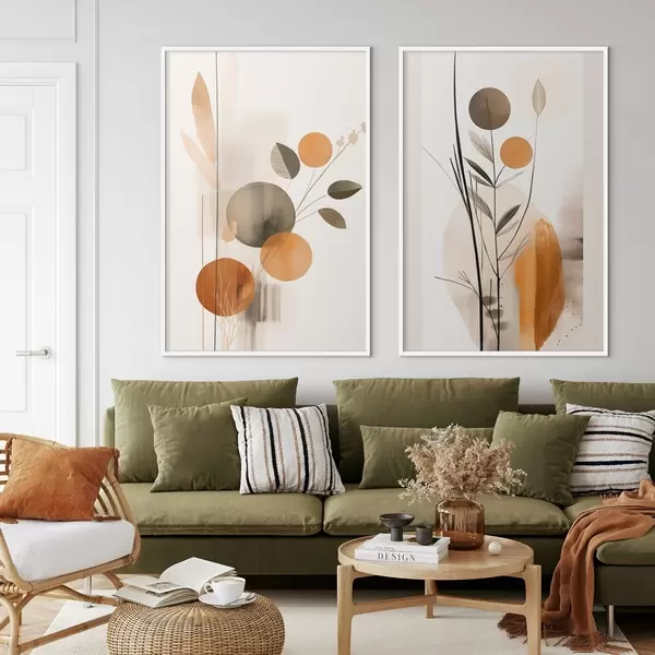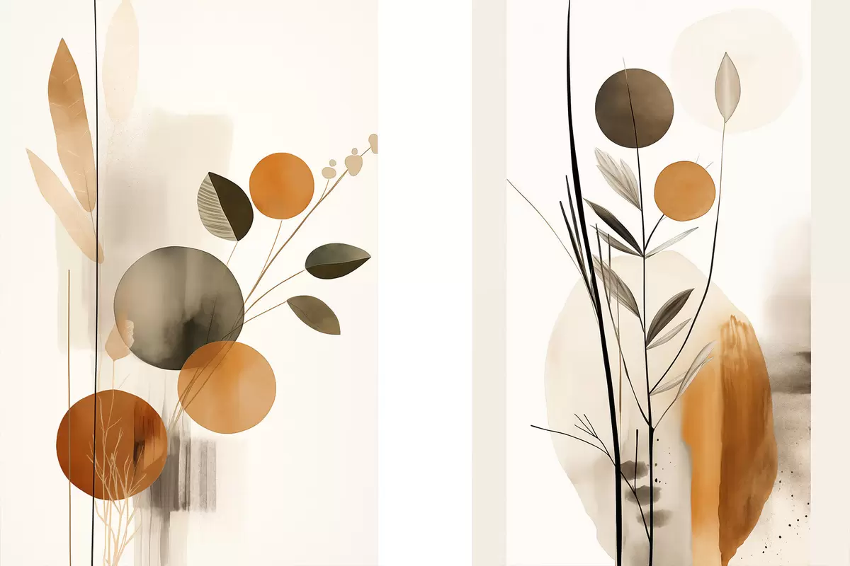 Poster Imitación de pintura abstracta con círculos naranjas y grises, hojas y ramas, estilo moderno, efecto acuarela. d01009