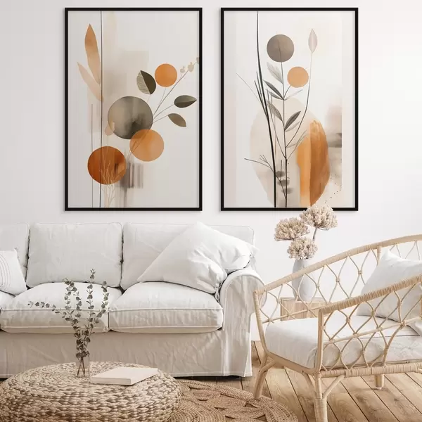 Poster Imitación de pintura abstracta con círculos naranjas y grises, hojas y ramas, estilo moderno, efecto acuarela. Nr d01009
