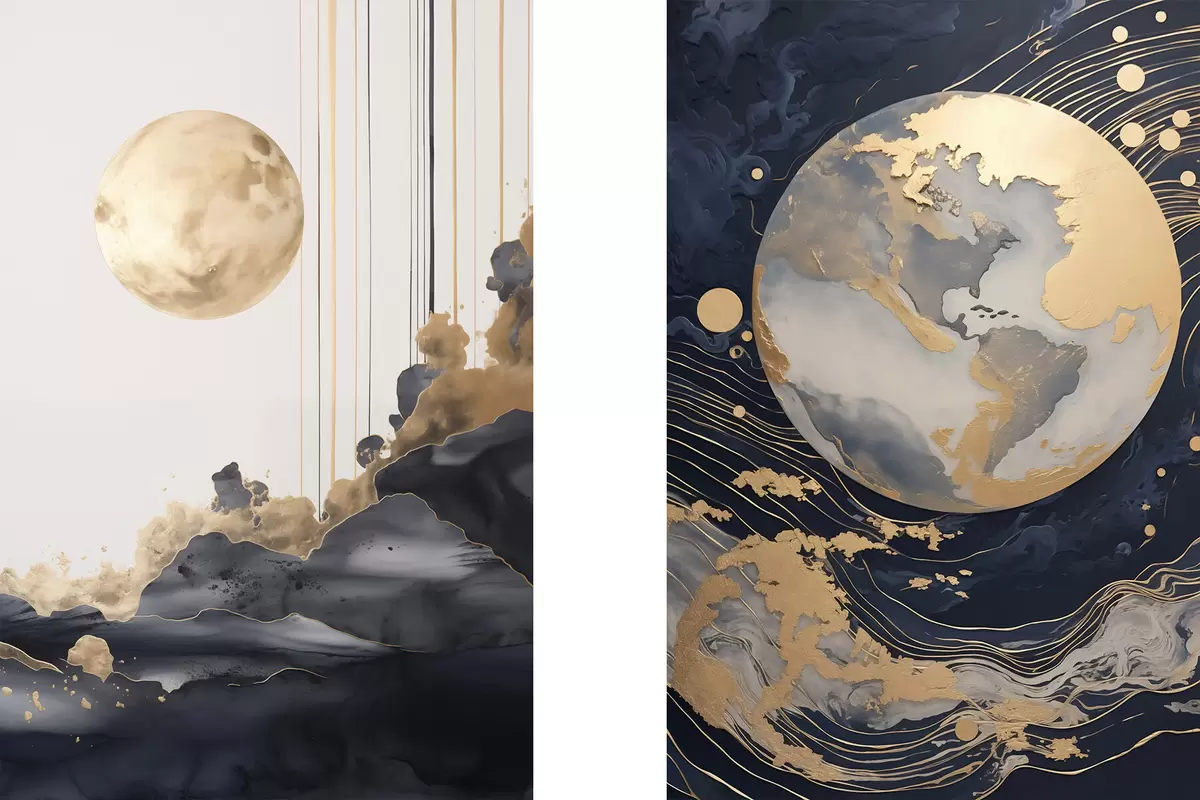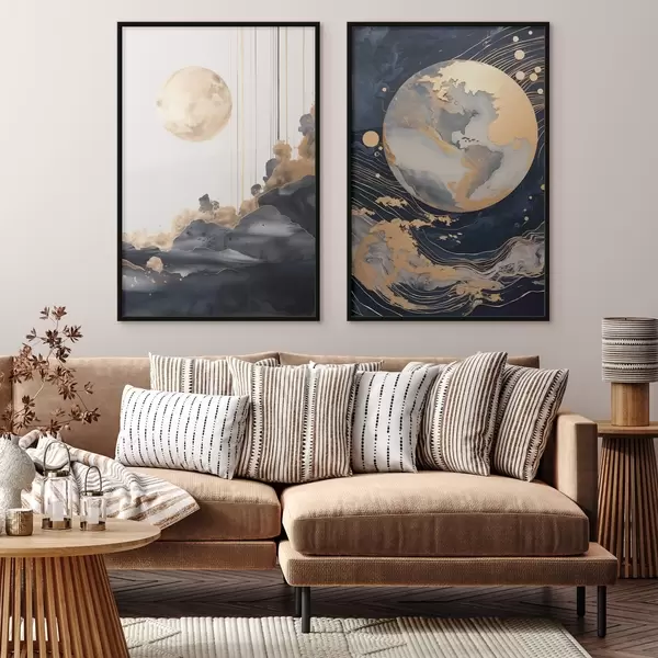 Poster Planeta decorativo texturizado en el espacio con líneas y puntos amarillos, estilo abstracto, minimalista y moderno. Nr d01014