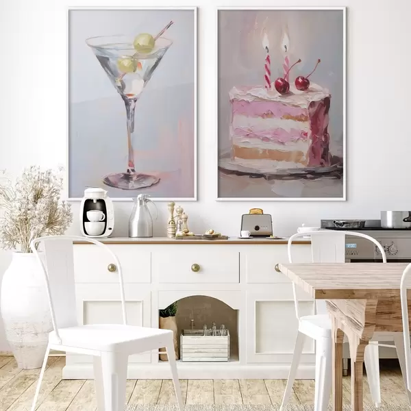 Poster Un vaso con una bebida y un trozo de tarta, pintura de imitación. Nr d01019