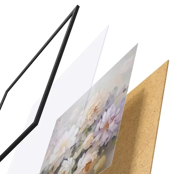 El póster consta de marco, plexiglás, imagen impresa y soporte de aglomerado. El póster puede colgarse inmediatamente en la pared gracias a los soportes de la parte posterior.