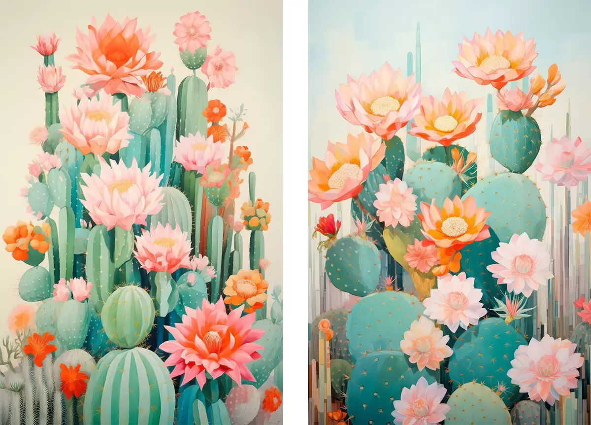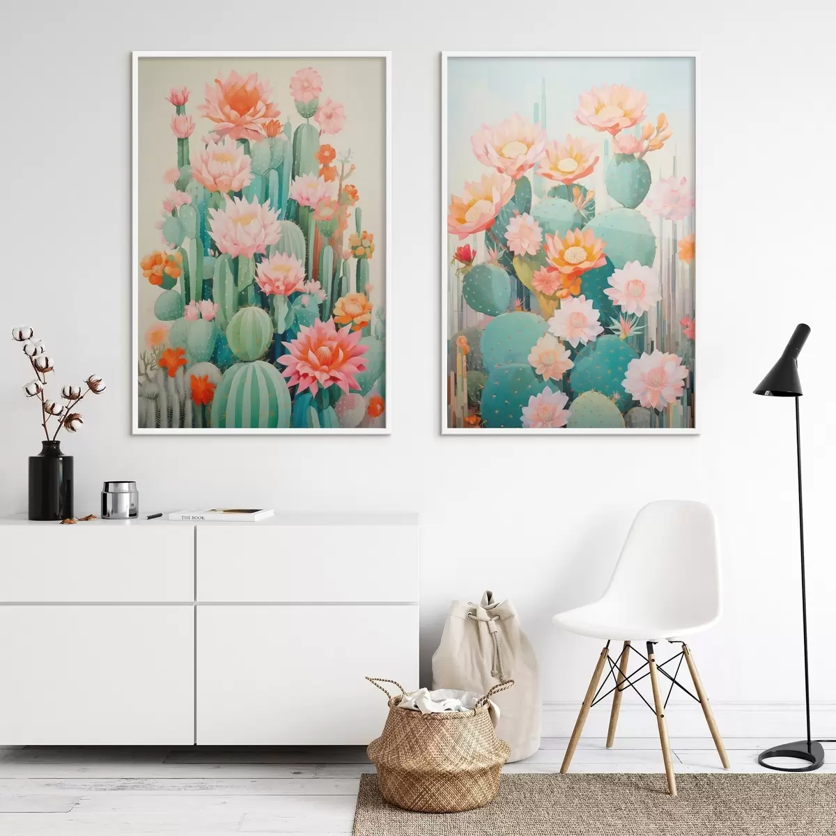 Poster Cactus con flores grandes, una paleta de colores pastel y una sensación de calma. d01086