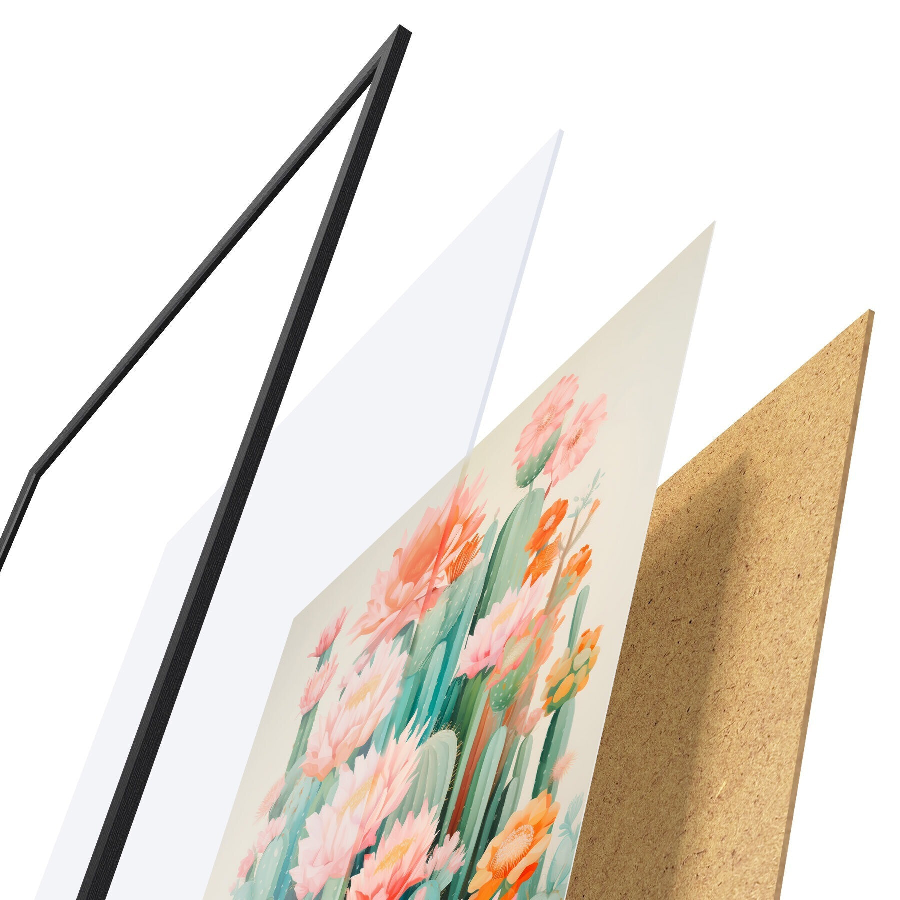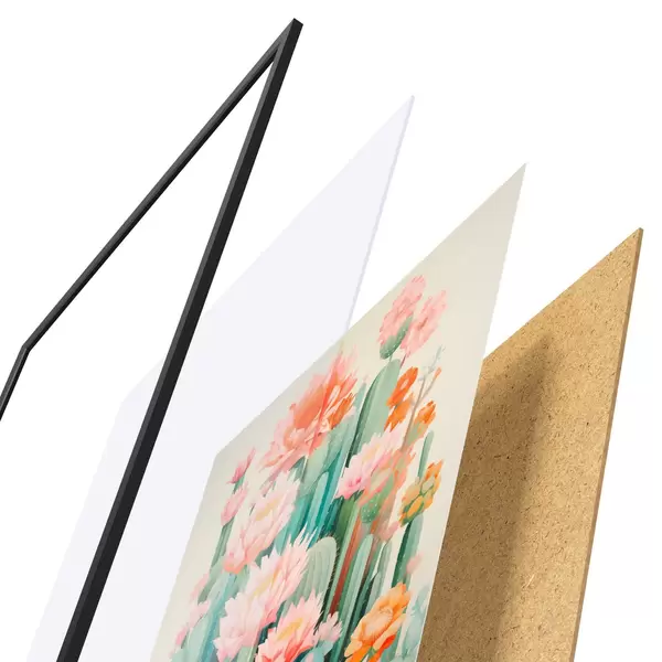 El póster consta de marco, plexiglás, imagen impresa y soporte de aglomerado. El póster puede colgarse inmediatamente en la pared gracias a los soportes de la parte posterior.