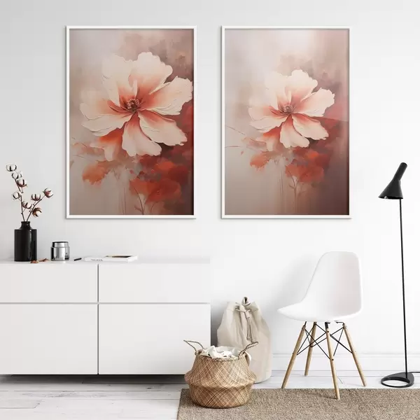 Poster Composición floral: pétalos blancos y crema, detalles en coral y un suave fondo brumoso. d01088