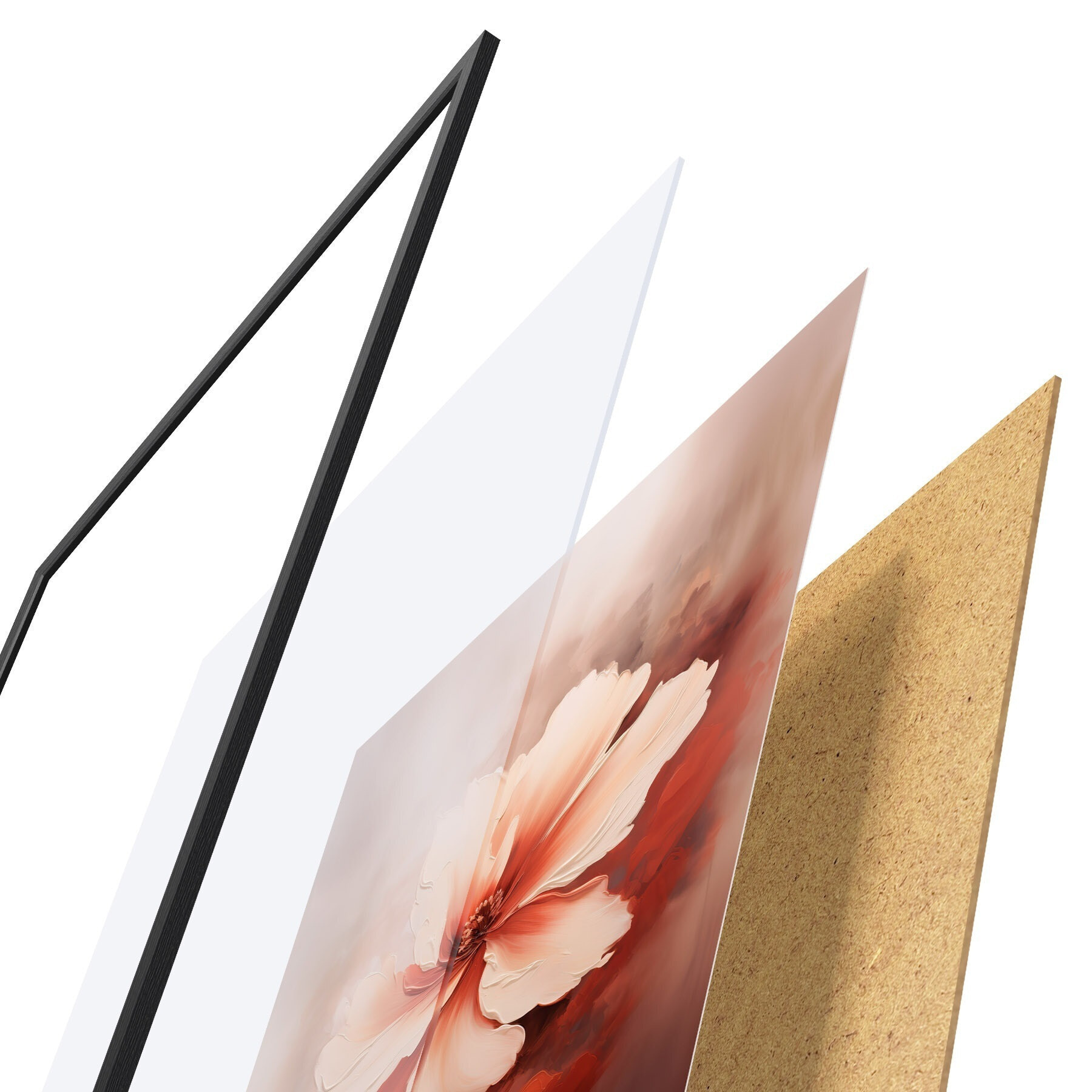 El póster consta de marco, plexiglás, imagen impresa y soporte de aglomerado. El póster puede colgarse inmediatamente en la pared gracias a los soportes de la parte posterior.