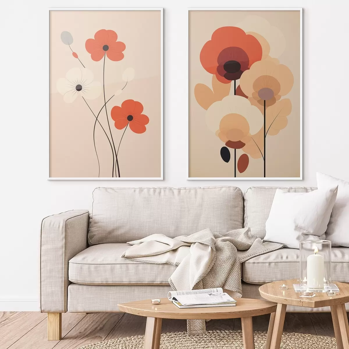 Poster Díptico floral minimalista en cálidos tonos beige-coral con líneas gráficas. d01090