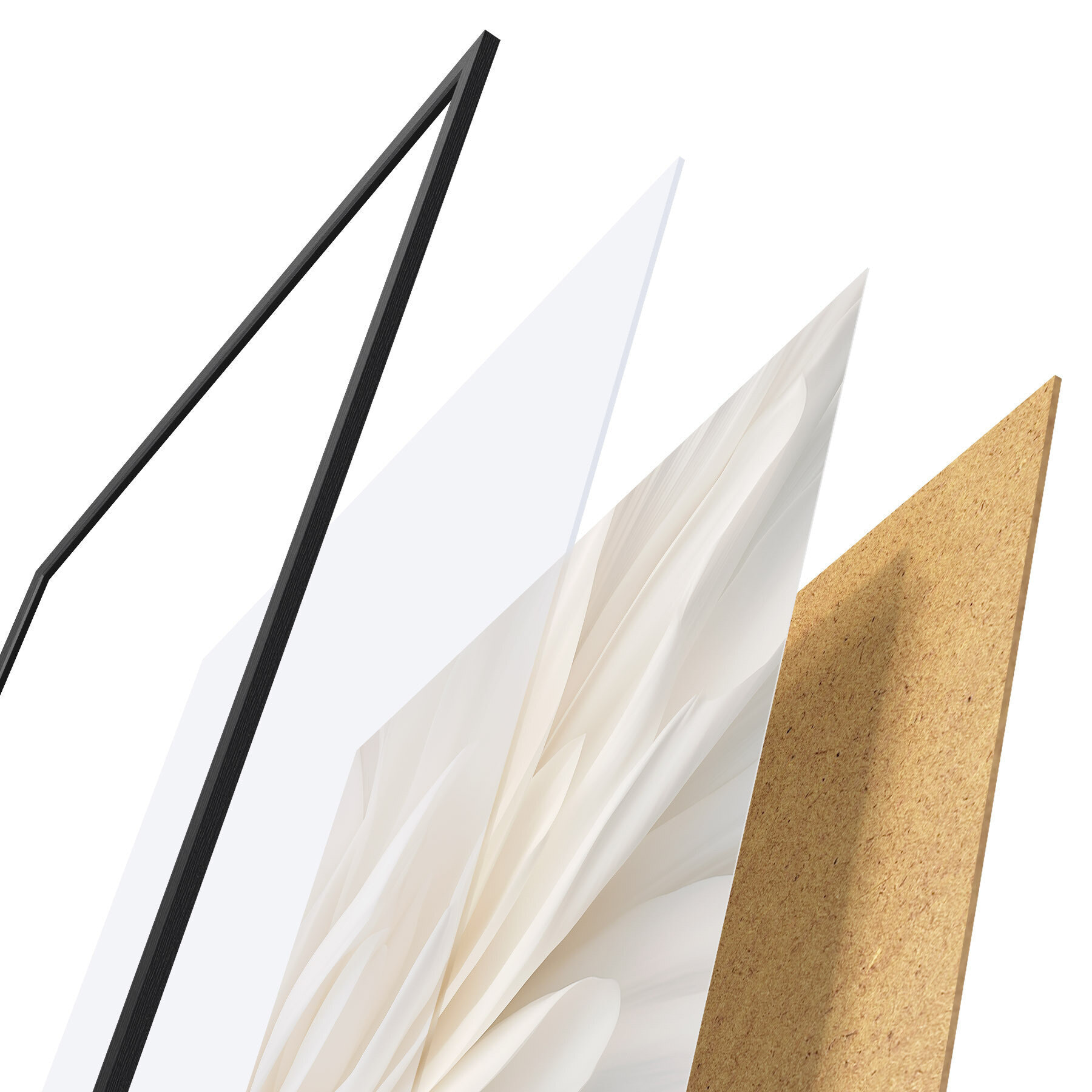 El póster consta de marco, plexiglás, imagen impresa y soporte de aglomerado. El póster puede colgarse inmediatamente en la pared gracias a los soportes de la parte posterior.