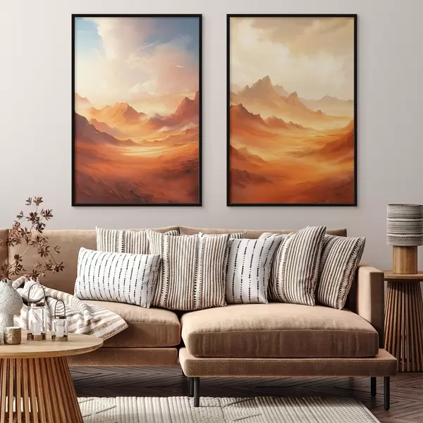 Poster Un vasto paisaje desértico de color naranja con imponentes montañas rocosas bajo un cielo brumoso y soleado con nubes tenues. d01122