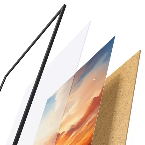 El póster consta de marco, plexiglás, imagen impresa y soporte de aglomerado. El póster puede colgarse inmediatamente en la pared gracias a los soportes de la parte posterior.