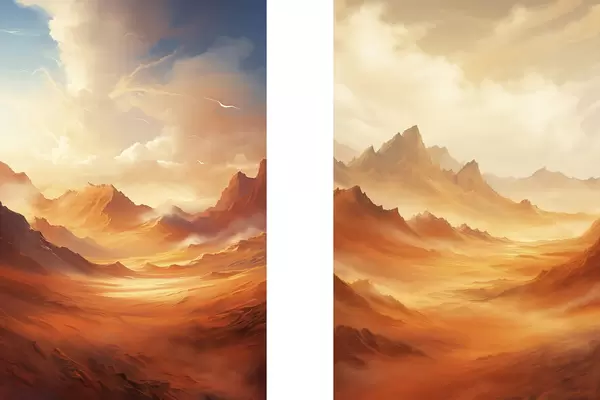 Poster Un vasto paisaje desértico de color naranja con imponentes montañas rocosas bajo un cielo brumoso y soleado con nubes tenues. d01122