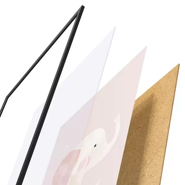 El póster consta de marco, plexiglás, imagen impresa y soporte de aglomerado. El póster puede colgarse inmediatamente en la pared gracias a los soportes de la parte posterior.
