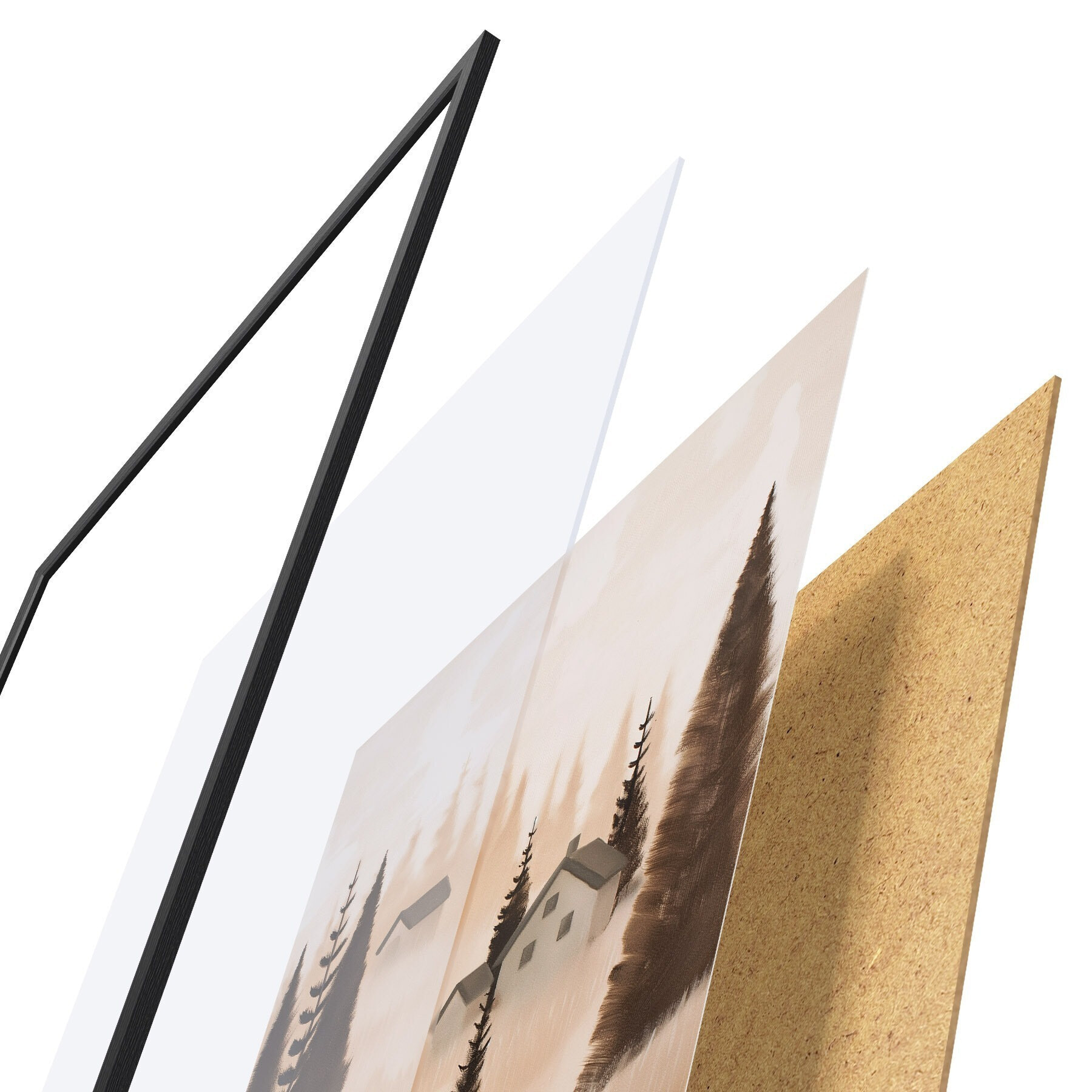El póster consta de marco, plexiglás, imagen impresa y soporte de aglomerado. El póster puede colgarse inmediatamente en la pared gracias a los soportes de la parte posterior.