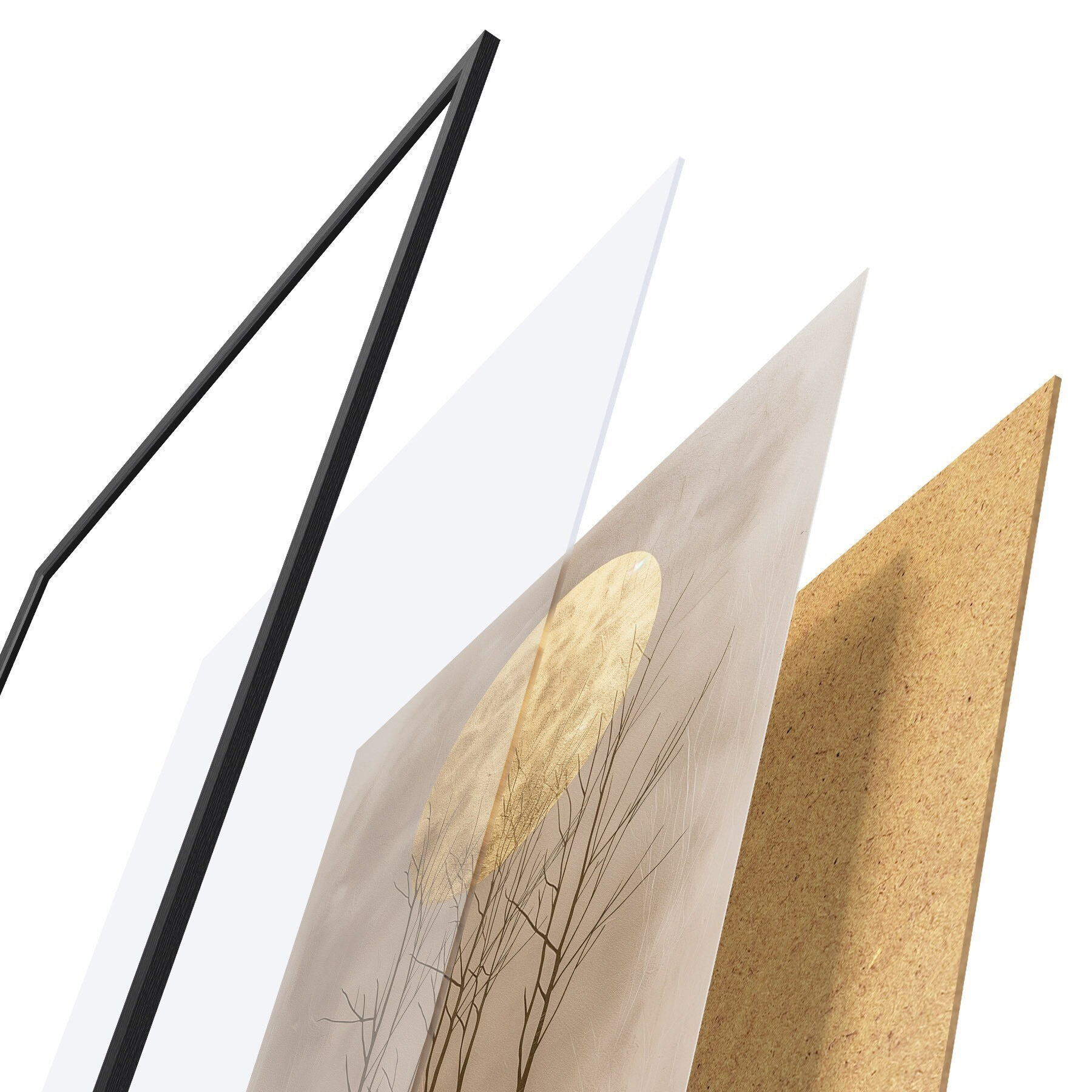 El póster consta de marco, plexiglás, imagen impresa y soporte de aglomerado. El póster puede colgarse inmediatamente en la pared gracias a los soportes de la parte posterior.