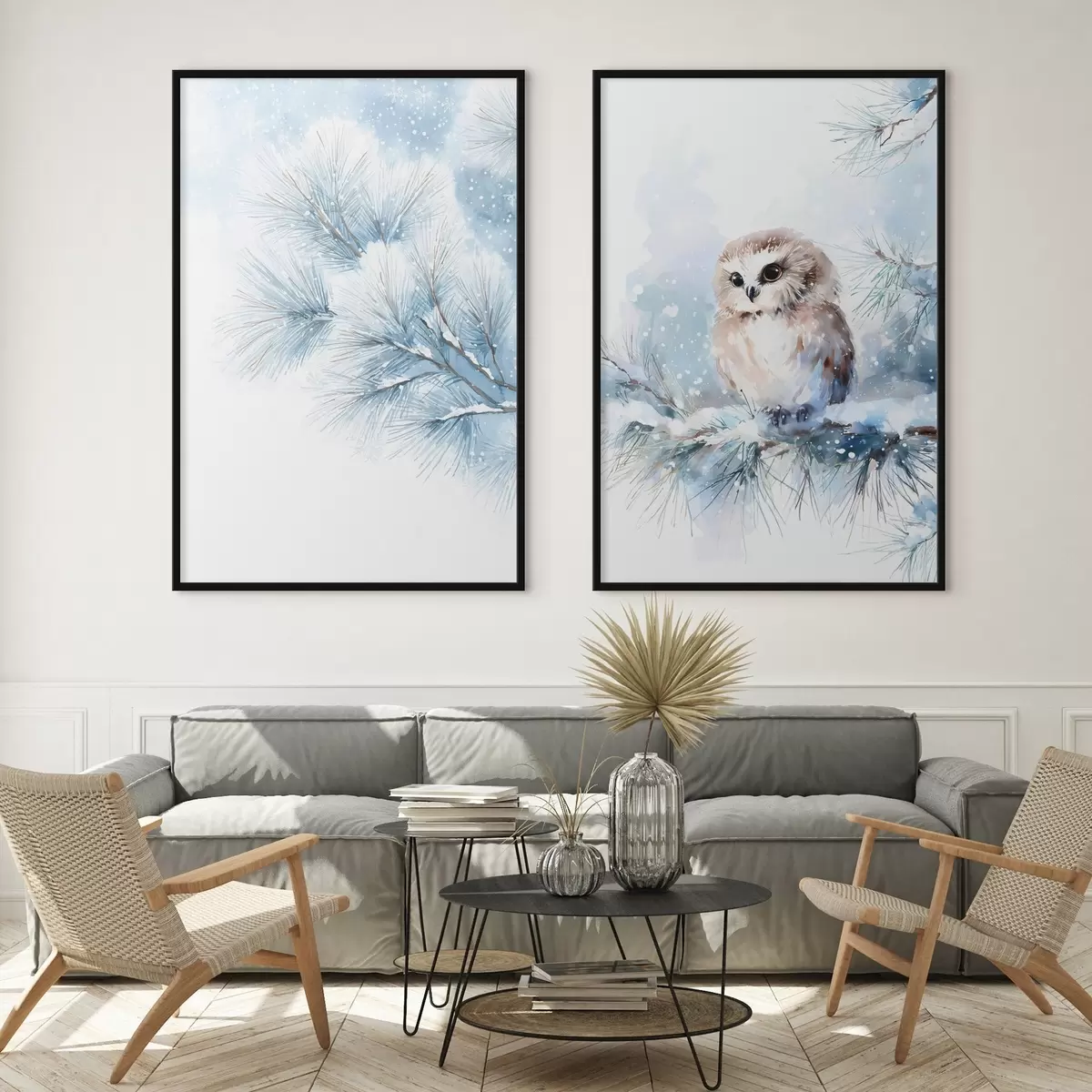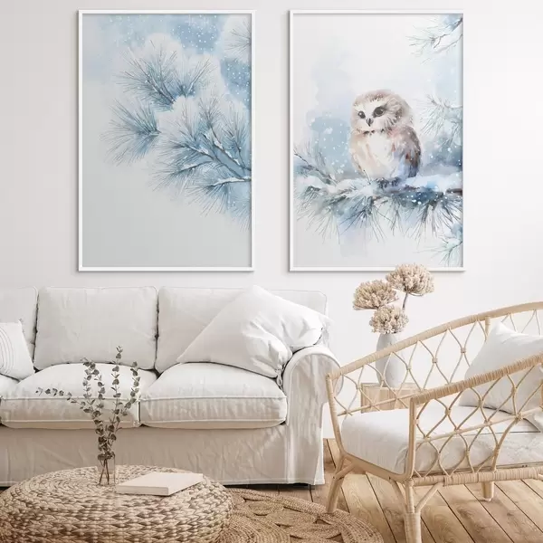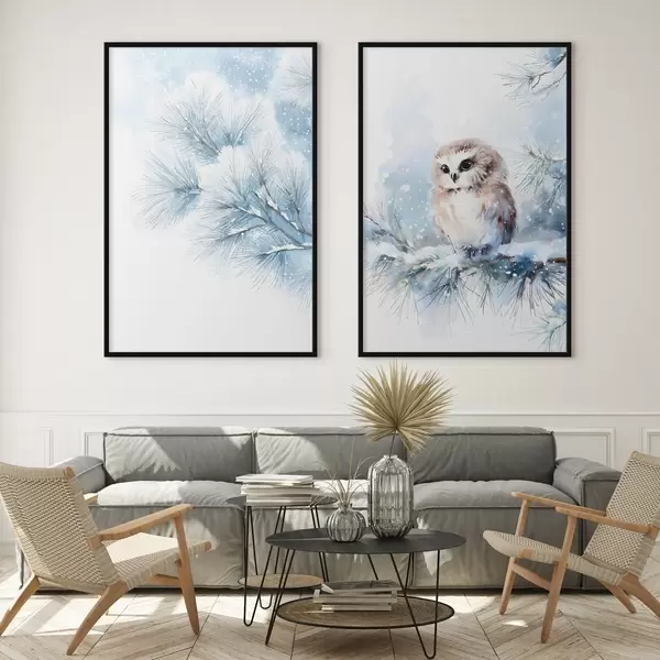 Poster Bonito búho sobre una rama de pino cubierta de nieve, pintado al estilo acuarela. Nr d01168