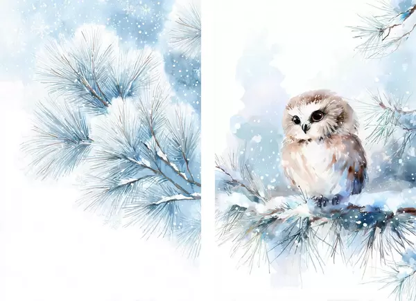 Poster Bonito búho sobre una rama de pino cubierta de nieve, pintado al estilo acuarela. Nr d01168