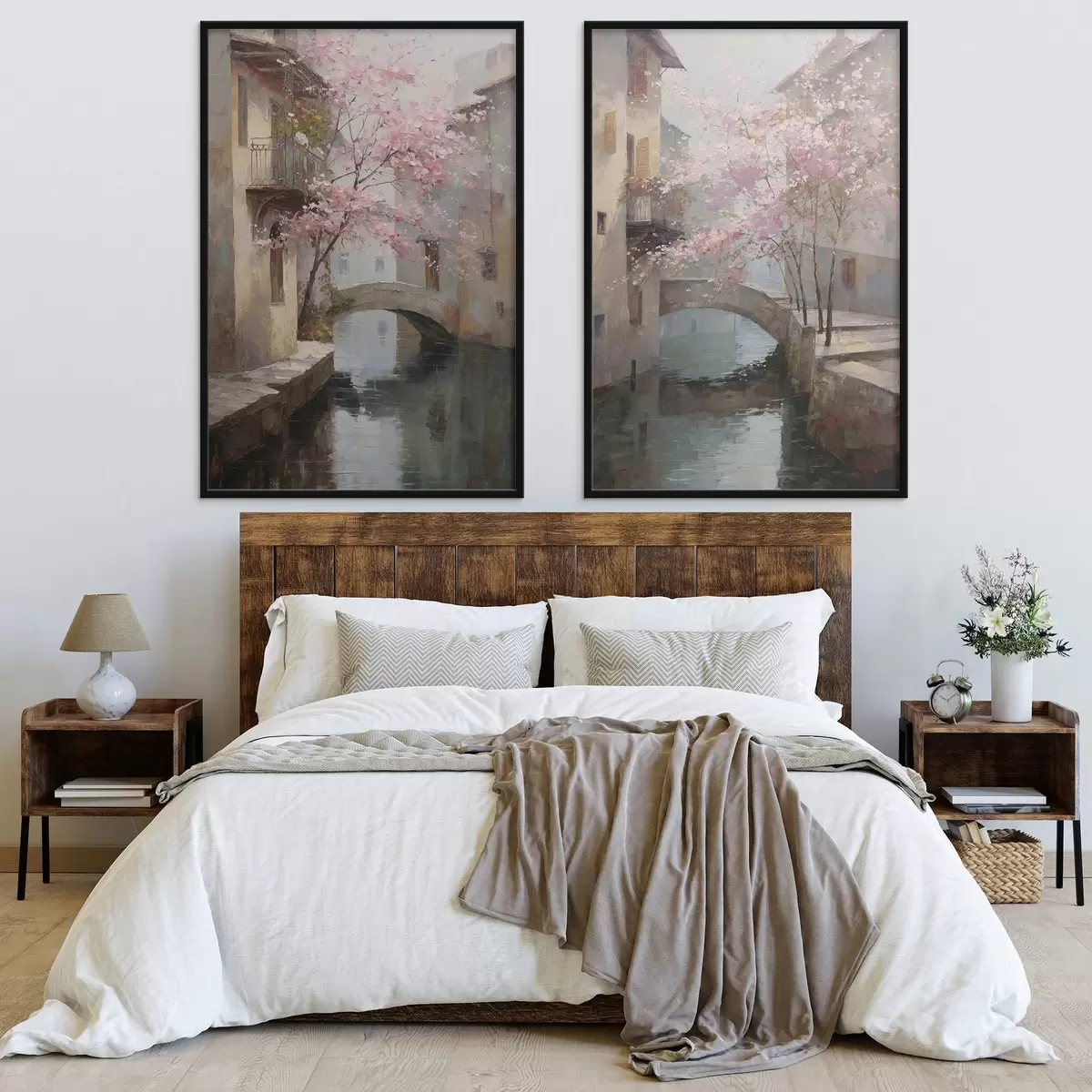 Poster Paisaje urbano romántico con un árbol en flor al estilo de la pintura al óleo. d01173