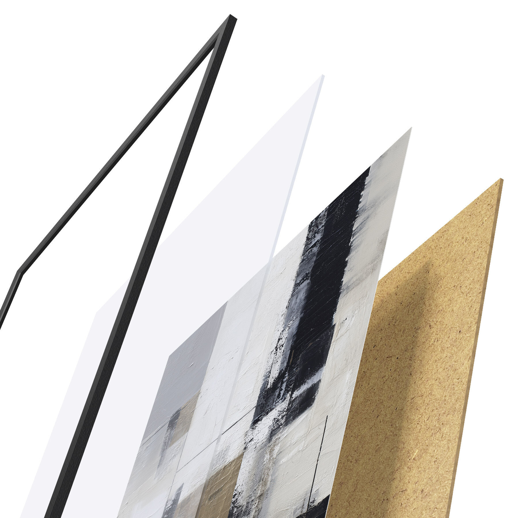 El póster consta de marco, plexiglás, imagen impresa y soporte de aglomerado. El póster puede colgarse inmediatamente en la pared gracias a los soportes de la parte posterior.