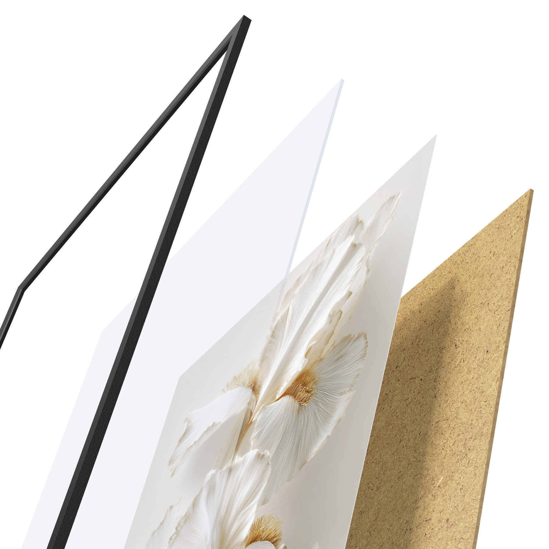 El póster consta de marco, plexiglás, imagen impresa y soporte de aglomerado. El póster puede colgarse inmediatamente en la pared gracias a los soportes de la parte posterior.