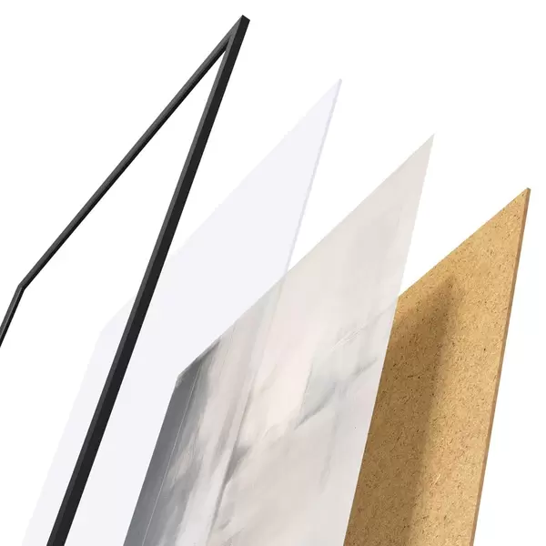El póster consta de marco, plexiglás, imagen impresa y soporte de aglomerado. El póster puede colgarse inmediatamente en la pared gracias a los soportes de la parte posterior.