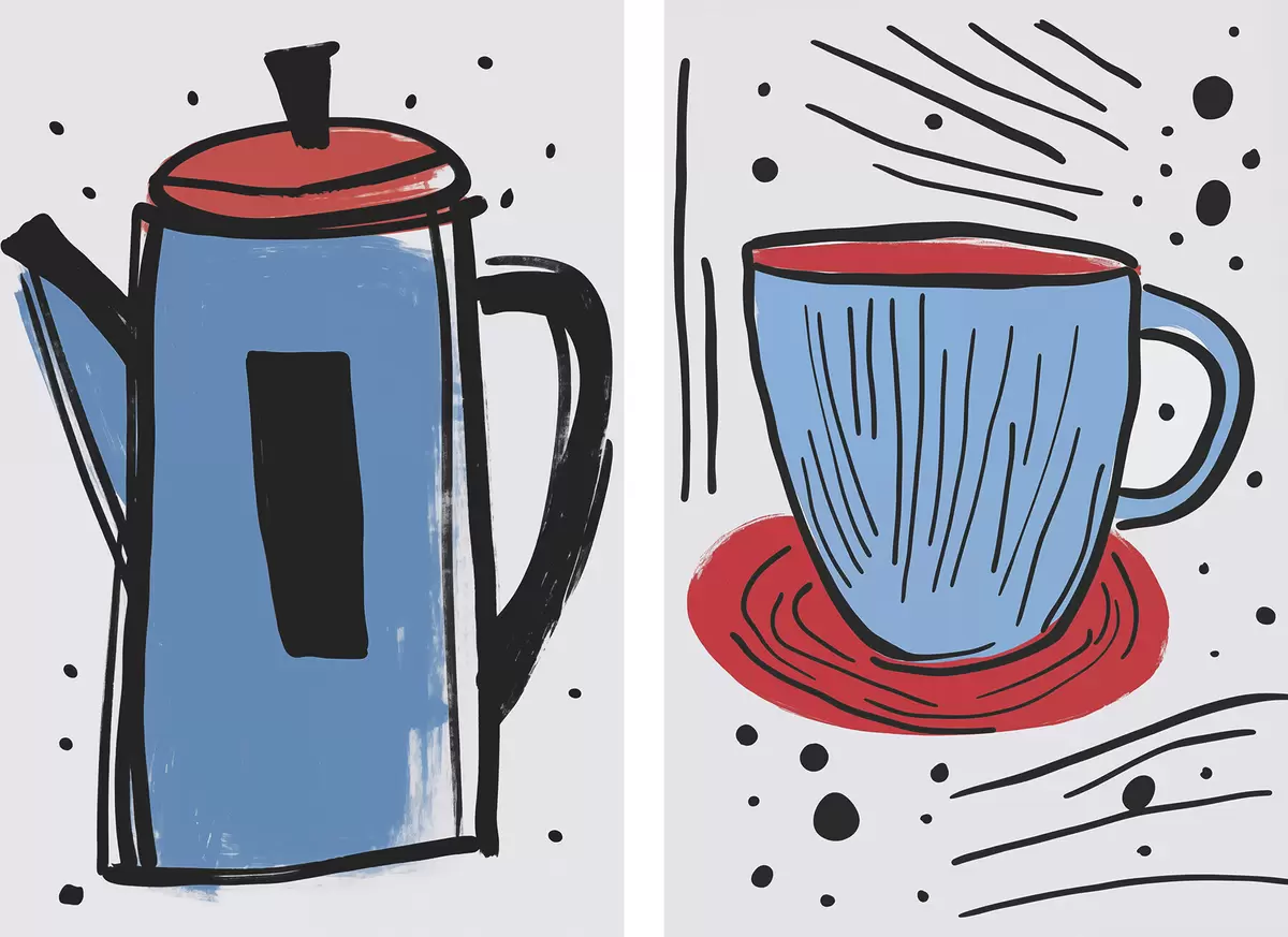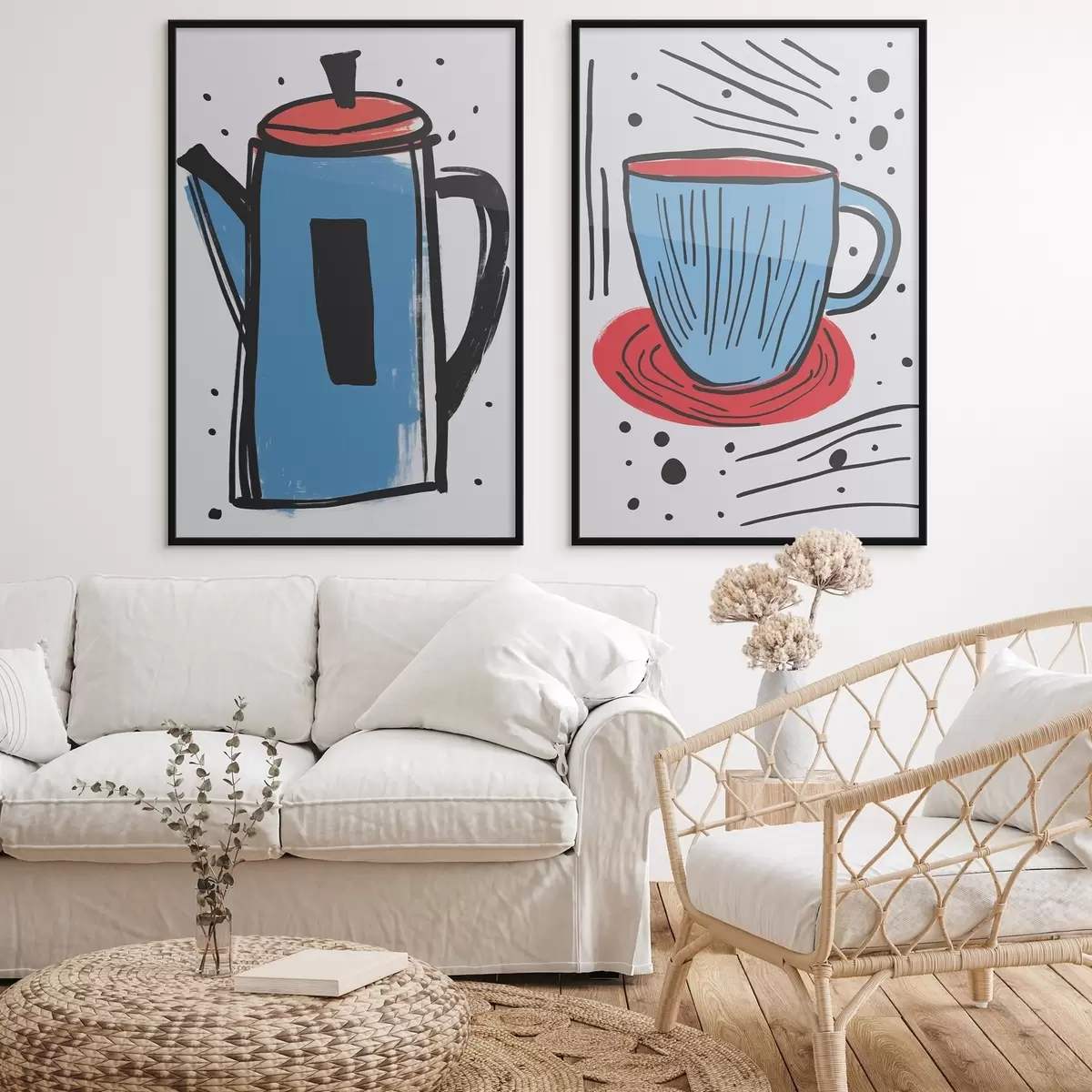Poster Cafetera y taza imitación de un dibujo primitivo Nr d01225