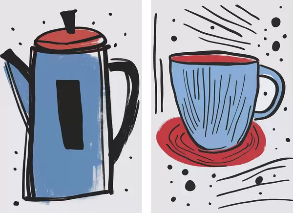 Poster Cafetera y taza imitación de un dibujo primitivo Nr d01225