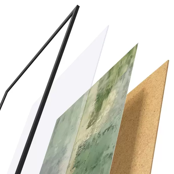 El póster consta de marco, plexiglás, imagen impresa y soporte de aglomerado. El póster puede colgarse inmediatamente en la pared gracias a los soportes de la parte posterior.