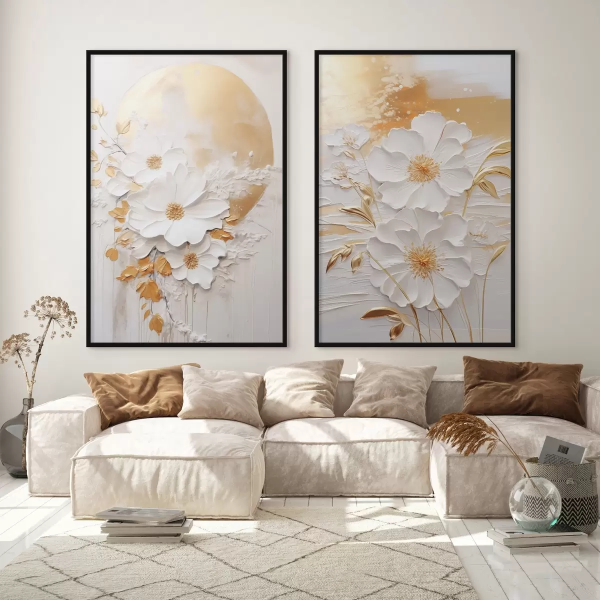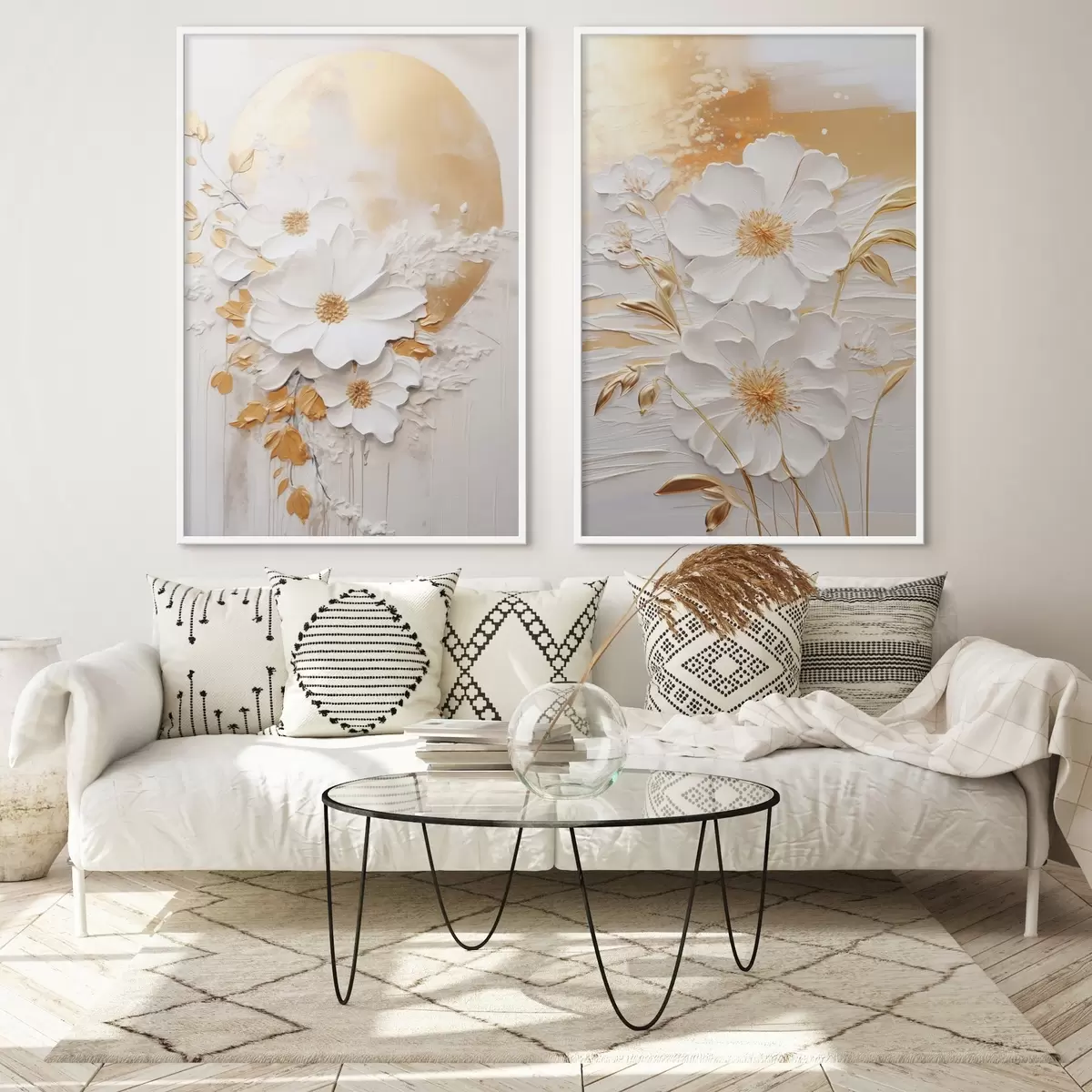 Poster Flores blancas con detalles amarillos y hojas delicadas sobre un fondo texturizado, arte moderno. d01233