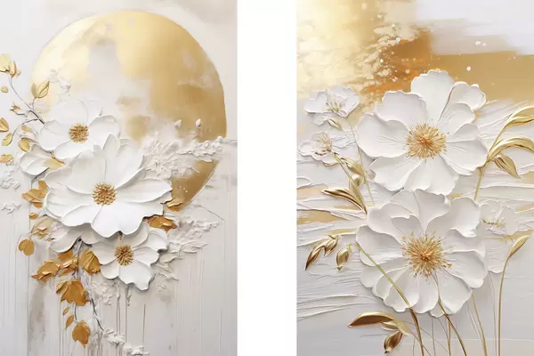 Poster Flores blancas con detalles amarillos y hojas delicadas sobre un fondo texturizado, arte moderno. Nr d01233