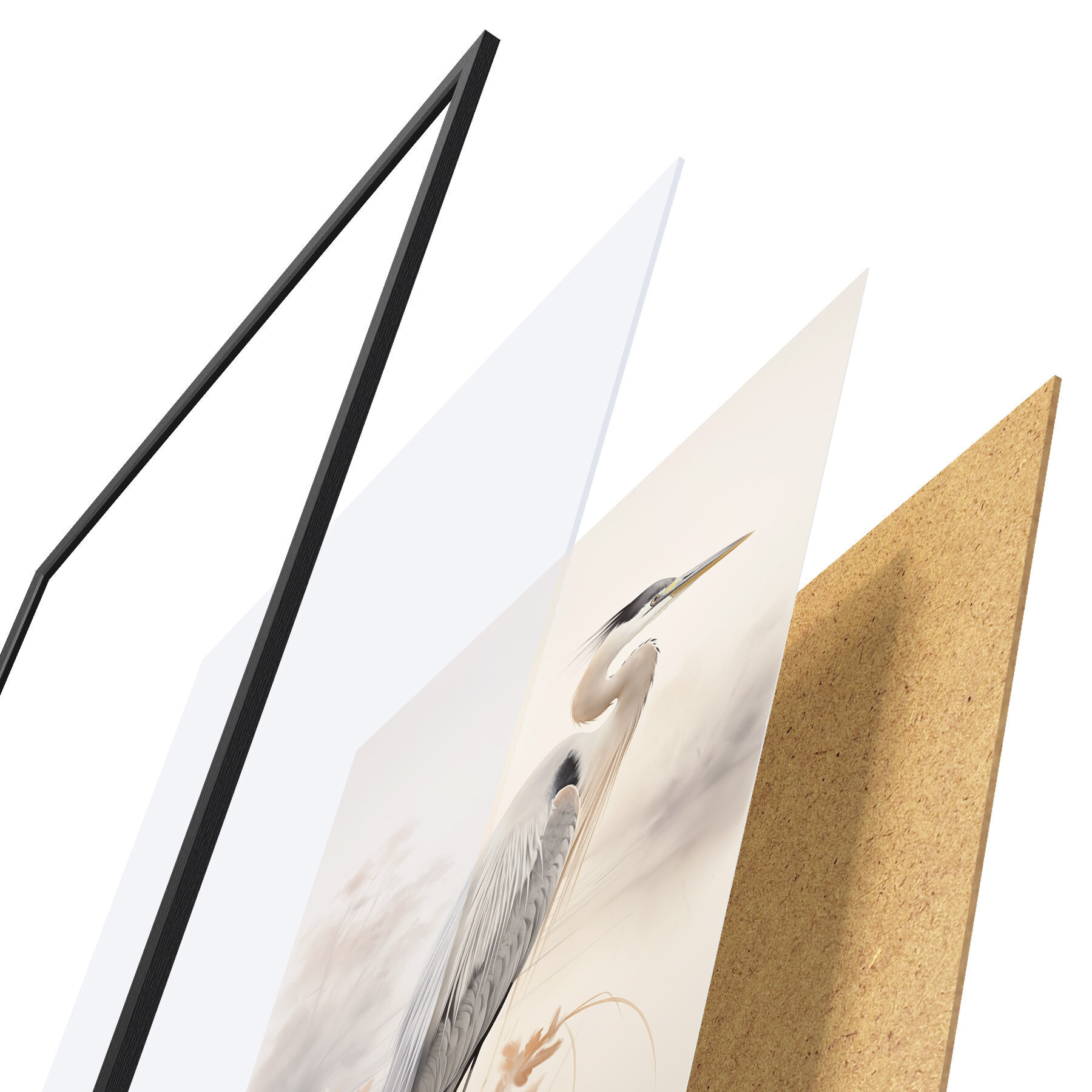 El póster consta de marco, plexiglás, imagen impresa y soporte de aglomerado. El póster puede colgarse inmediatamente en la pared gracias a los soportes de la parte posterior.
