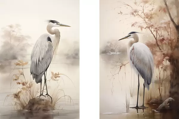 Poster Una garza se posa sobre una roca en un lago con altos pastos y árboles al fondo. d01239