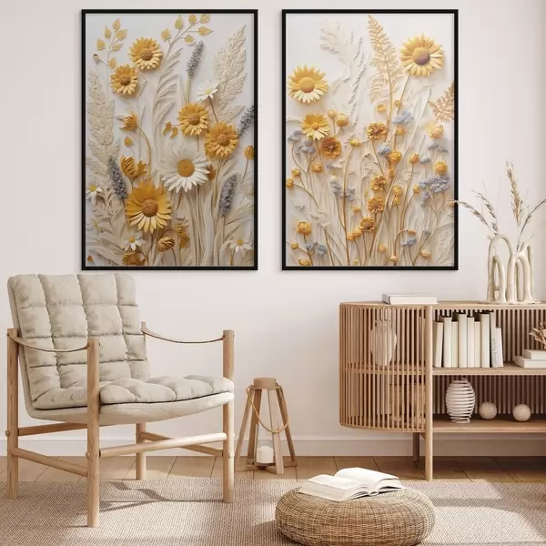 Poster Una colección texturizada de margaritas amarillas y blancas con hierbas secas y ramitas de lavanda sobre un fondo blanco. d01241