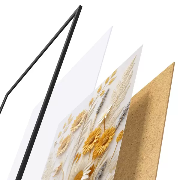 El póster consta de marco, plexiglás, imagen impresa y soporte de aglomerado. El póster puede colgarse inmediatamente en la pared gracias a los soportes de la parte posterior.